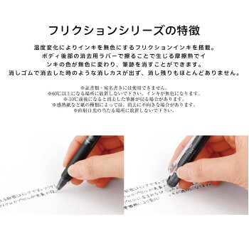 「フリクションインキ」には消色温度が設定されているため、筆跡をボディ後部の専用ラバーで擦ることで生じる摩擦熱によりインキの色が無色に変わり、筆跡を消すことができます。