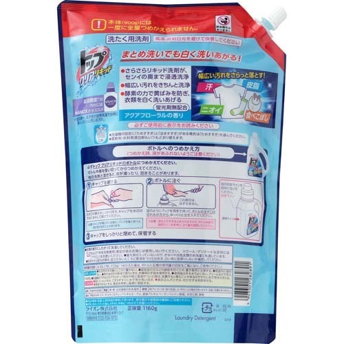 お店TOP>掃除・洗濯>洗濯洗剤>洗濯洗剤(液体)>トップ クリアリキッド 洗濯洗剤 詰め替え (1160g*3袋セット)【トップ クリアリキッド 洗濯洗剤 詰め替えの商品詳細】●「まとめ洗いでも白く洗いあがる」●さらさらリキッド洗剤が、繊維の奥まで浸透洗浄●幅広い汚れをきちんと洗浄●酵素の力で黄ばみを防ぎ、衣類を白く洗いあげる●すすぎ1回OK●蛍光剤無配合●アクアフローラルの香り【使用方法】水30Lに対して25g【成分】界面活性剤(21% ポリオキシエチレンアルキルエーテル、直鎖アルキルベンゼンスルホン酸塩)、安定化剤、酵素【注意事項】・乳幼児の手の届くところに置かない。